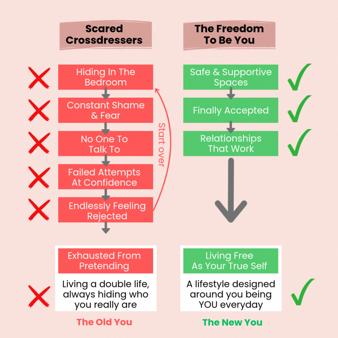 It gives you the exact scripts and strategies that have helped hundreds of crossdressers dissolve decades of shame. To have those impossible conversations with partners, and to finally stop living in constant fear of discovery.
